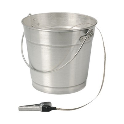 Balde em alumínio, em modelo com ou sem cordoalha confeccionada em cabo de aço e revestido com PVC cristal, tendo alça para transporte.