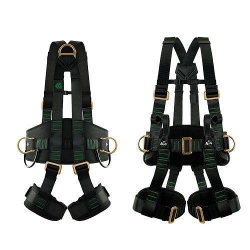 Três meia argolas em aço forjado bicromatizado: Uma dorsal para retenção de queda e duas laterais curvadas para posicionamento.