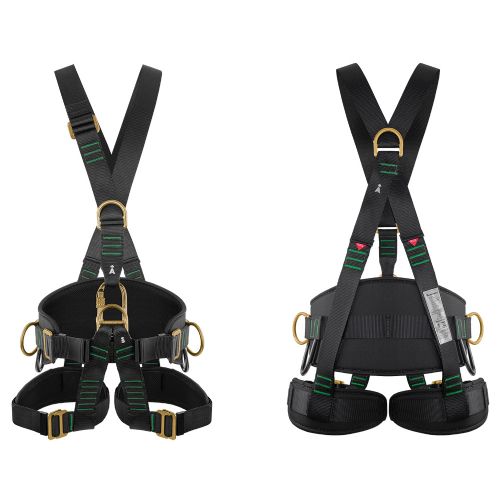 Cinco meia argolas em aço forjado bicromatizado: Uma dorsal e uma peitoral para retenção de quedas, uma umbilical para suspensão e duas laterais curvadas para posicionamento.