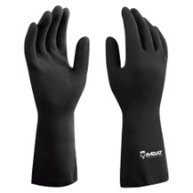 Luva de segurança confeccionada em látex natural de cor preta, internamente forrada, com acabamento antiderrapante na palma, face palmar dos dedos e pontas.