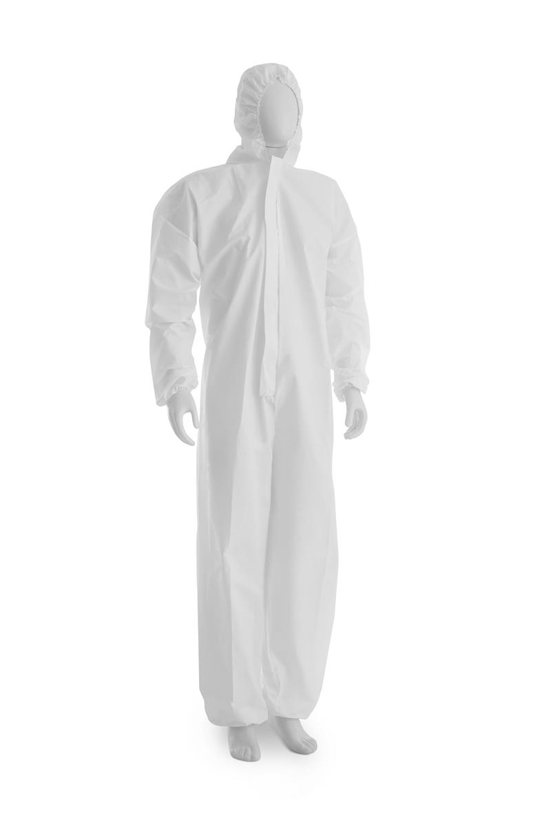 VESTIMENTA DE SEGURANÇA TIPO MACACÃO, CONFECCIONADO EM POLIPROPILENO (NÃO TECIDO) LAMINADO COM FILME DE POLETILENO, FECHAMENTO FRONTAL COM ZÍPER E PALA DE PROTEÇÃO, ELÁSTICO NO CAPUZ, PUNHO E TORNOZELOS. PARA PROTEÇÃO DO CRÂNIO, PESCOÇO, TRONCO, MEMBROS SUPERIORES E INFERIORES DO USUÁRIO CONTRA RISCOS QUÍMICOS.