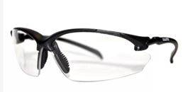 Óculos de proteção, constituídos de arco de material plástico (náilon) com canaleta dividido em duas partes pela ponte, onde estas partes suportam lentes confeccionadas em policarbonato, encaixadas nas canaletas do arco, apoio nasal com plaquetas de borracha PVC encaixadas em dois pinos de plástico, hastes tipo espátula confeccionadas do mesmo material do arco e fixadas ao arco por meio de parafuso metálico.